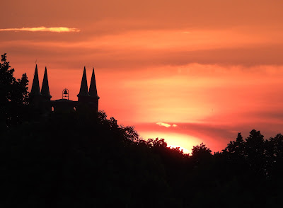 Auringon matka, viimeiset säteet kirkon takaa ja vesitornin ohi